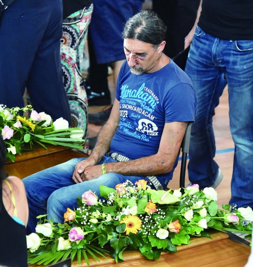8月27日,阿斯科利皮切诺的遇难者葬礼在体育馆举行,一名男性坐在亲人的棺木旁。