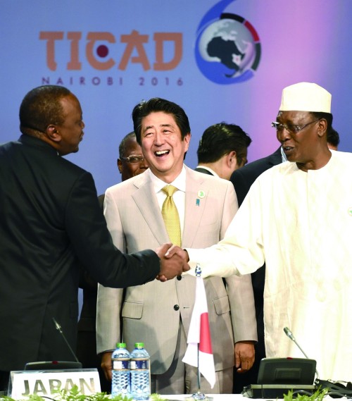 8月28日,出席第六届非洲开发会议的安倍晋三在肯尼亚总统肯雅塔(左)与乍得总统代比(右)中间微笑。图片来源 CFP