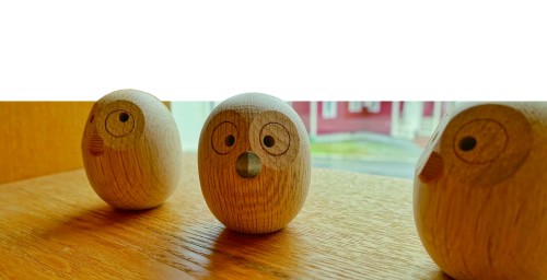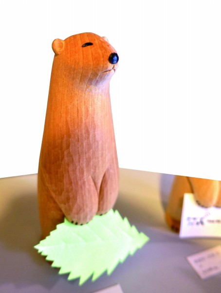 在柔暖的灯光下,各色各样木器小物整齐排列在展示架上,只觉得自己走进了栓木的童话世界。我挚爱的KAMI杯,居然还分瘦高款和矮胖款,不同大小型号的杯子像俄罗斯套娃般列队向我行礼,不,是向我的钱包行礼呢。还有那些小动物、小摆设,都千姿百态地卖着萌。我发现高桥工艺的木制品几乎没什么大件,都是可以摆在桌上当装饰物的精致小玩意儿,无论是手持便签的小熊、躲在杯子中的小雏鸡,还是摆在桌子上的人脸眼镜架、随身携带的药盒,甚至还有年代感极强的积木,卖相触感都可圈可点,最诱人的是那婴儿皮肤般的手感,每一件作品都像被把玩了多年并上了包浆的灵气十足的文玩,树木的灵气直接滑进皮肤。