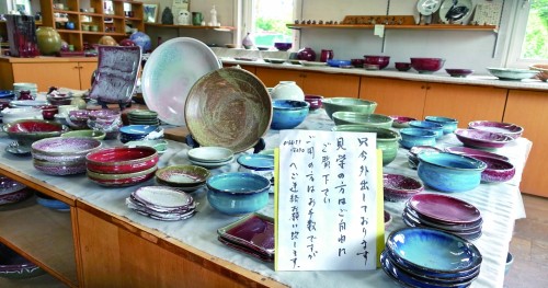 大叔看到屋里居然有几位客人,条件反射般道出了“欢迎光临”,打过招呼后,便走到一个权当是柜台的箱子后面站定,把玩起几件陶瓷小碟子,不再关注我们。我试着跟高冷的大叔搭讪,问了一句这些器物上的花纹是画上的还是烧制时自然龟裂的。大叔发现我 真是对陶瓷感兴趣,眯缝着的眼睛迅速瞪大了,马上热情地给我介绍起来,语速之快、信息量之大令我猝不及防。大叔大概是憋坏了,我感到了他渴望与人交流的强烈意愿,但飞快的语速使我对自己的日语听力顿时失去了信心,我只听清楚了几个主要的词,大致意思是这风格的作品最早自法国引进,都是手工制作,花纹是自然烧制而成云云。
