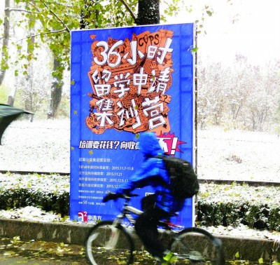 2015年11月22日,清华大学,一名学生骑车经过某留学申请培训营的广告。