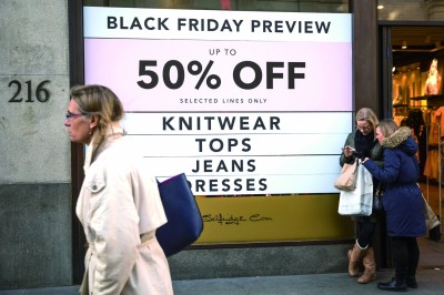 当地时间11月22日,英国伦敦牛津街,行人走过写着“黑色星期五”打折信息的广告牌。