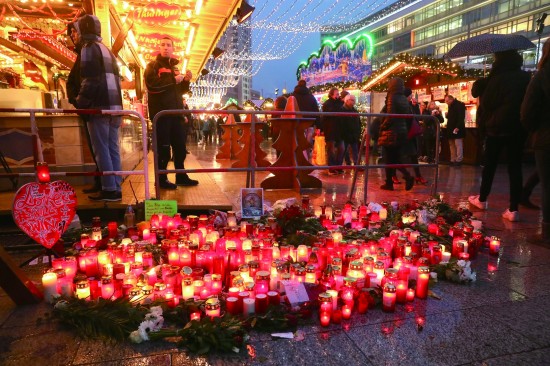 在遭到恐怖袭击的柏林圣诞市场,民众用蜡烛和鲜花悼念遇难者。
