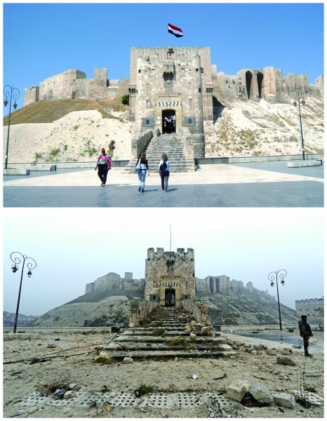 叙利亚阿勒颇古城堡。上图拍摄于2010年8月9日,下图拍摄于2016年12月13日。