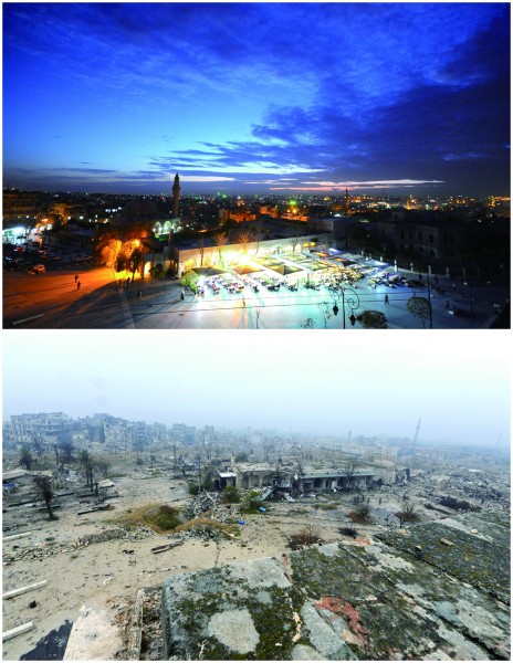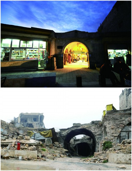 阿勒颇城区。上图拍摄于2008年11月24日,下图拍摄于2016年12月13日。
