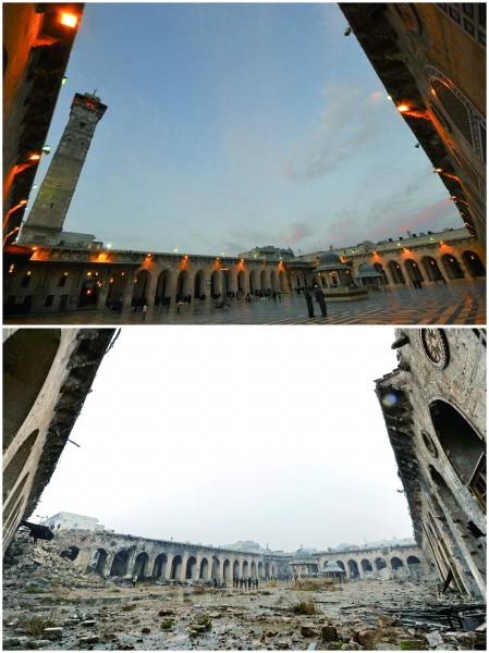 阿勒颇倭马亚大清真寺。上图拍摄于2009年3月12日,下图拍摄于2016年12月13日。