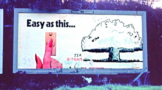 1983年11月,圣克鲁斯市的这块广告牌启用3天后被“广告真相小组”的“B小队”涂改,是这个组织工作量最大的一次,中途还有一名成员被挂在了上面。
