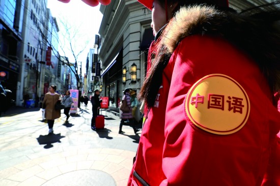 3月6日,首尔明洞街头的商店为吸引中国游客,在店员制服上标明可说中文。