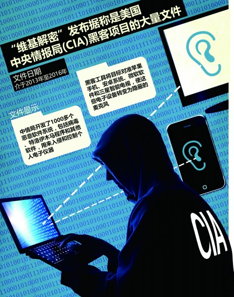 据《华盛顿邮报》报道,“维基解密”网3月7日公布了8761份关于美国中央情报局(CIA)的泄密文件,显示该机构大范围地针对智能手机、个人电脑、电视、汽车电脑等日常电子设备使用黑客工具。“维基解密”创始人朱利安·阿桑奇强调,这是CIA“有史以来最大规模的机密文件泄露事件”。
