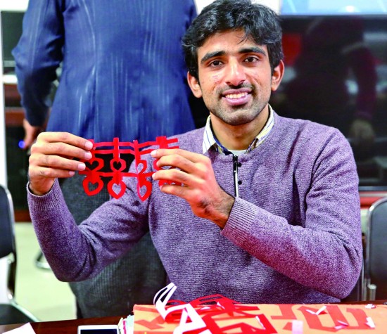 1月18日,秦皇岛某社区内,一名巴基斯坦留学生在学习剪窗花。