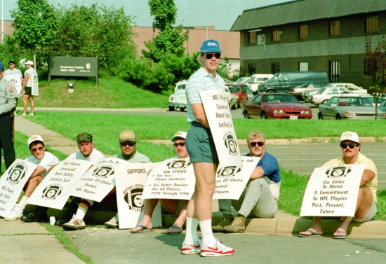 1987年9月,NFL华盛顿红皮队四分卫乔·施罗德(站立者)与队友们身挂要求更好待遇的标语牌举行罢工。
