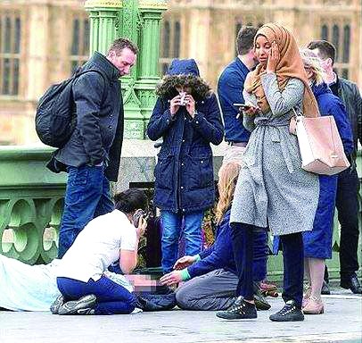 另一张照片中,大桥上走过一名裹着头巾的穆斯林女性,她一手拿着手机,一手托在脸颊旁,面部表情并不明显,而她身边的地上躺着恐袭案的伤者。网民攻击她“无动于衷、态度漠然”。