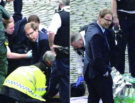 议会大厦遭袭后,英国外交部中东与非洲事务高级官员托比亚斯·埃尔伍德立刻冲到被刺伤的警察帕尔默身边,为他口对口做人工呼吸,并试图通过向伤口施压来阻止血液流失。医护人员赶来后,站起身的埃尔伍德的前额和双手都染上了鲜血。