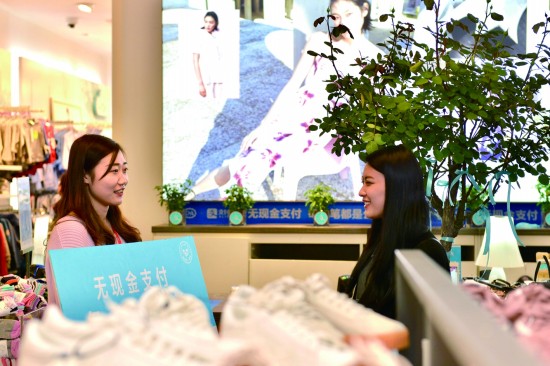 3月12日,北京某商场内,推荐“无现金支付”的柜台。