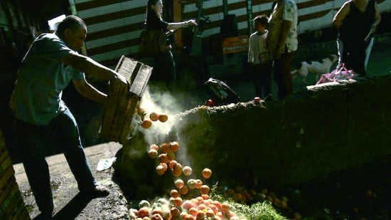 在布宜诺斯艾利斯,人们将外形不达标的柑橘整箱倒进垃圾场。