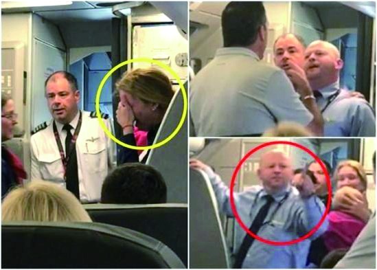 美国航空一航班近日发生空乘粗暴对待乘客事件。图为机上其他乘客拍摄的现场视频截图,黄圈为遭受粗暴对待的女乘客,红圈为施暴空乘。
