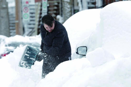 当地时间3月15日,加拿大蒙特利尔遭暴风雪袭击,民众在清理掩埋了汽车的积雪。图片来源CFP