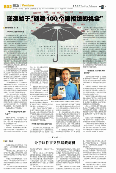 美国“商业内参”网站称,每一次被拒绝,蒋甲都能从中有所收获。他在演讲中回忆道:“其实别人拒绝你都是有原因的,只要你多问几句,不可能也许就会变成可能。”