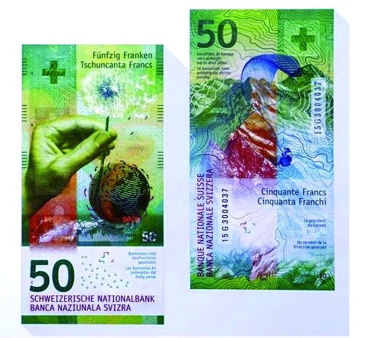 获奖的50瑞士法郎于2016年4月12日开始流通,是该国第九套进入流通的纸钞中最先发行的一张。其票面主题为“风”,主色为绿色。纸币正面印有标注着风向的地球和一只拿着蒲公英的手,背面为一个在瑞士阿尔卑斯山区随风飞翔的滑翔伞,寓意瑞士与世界相连。