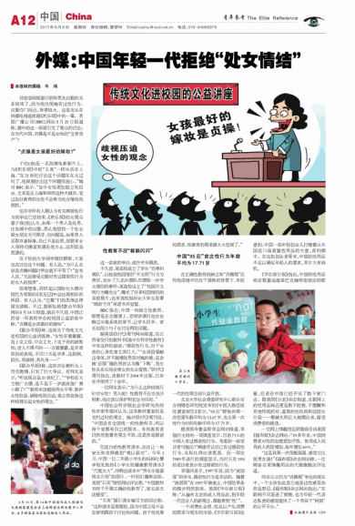 外媒:中国年轻一代拒绝“处女情结”