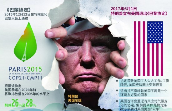 虽然外界表现惊诧,但对特朗普来说不是突发奇想。早在竞选总统之前,他就发表过与气候变化否认者一致的言论,包括2012年在推特网上发文称“气候变化是中国编出来的概念”。他还威胁将在当上总统的100天内“取消”《巴黎协定》。如今,这位政坛新人在超出“承诺期”1个多月后宣布,要带领美国撤出具有历史性意义的全球减排协议。