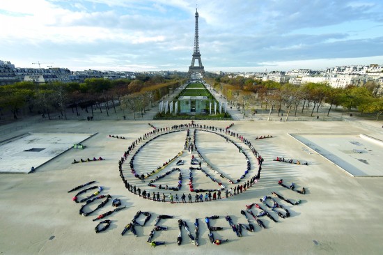 2015年12月6日,巴黎气候变化大会通过《巴黎协定》之前,环保人士在埃菲尔铁塔下呼吁可持续发展。