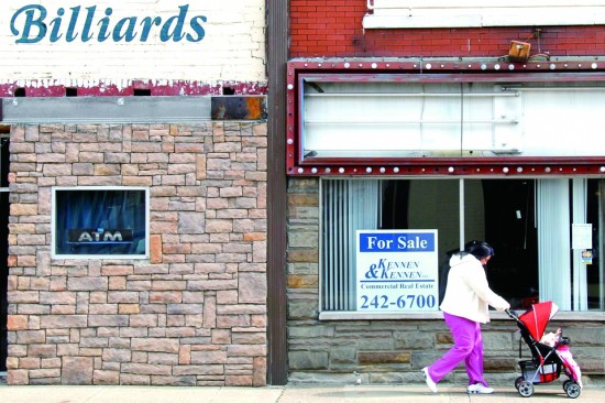西弗吉尼亚一座“铁锈城市”,街道冷冷清清,一位女性推着婴儿车走过待售的门面房。