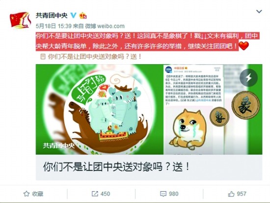 5月18日,共青团中央在微博上表示:“你们不是要让团中央送对象吗?送!”