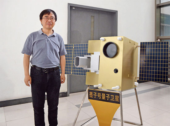 6月16日,量子科学实验卫星首席科学家潘建伟与“墨子号”量子卫星模型合影。