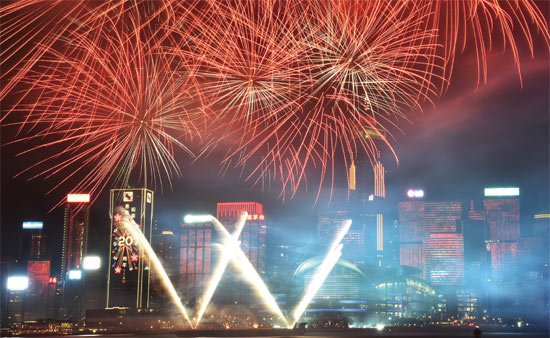 7月1日晚,香港举行大型烟花汇演,庆祝香港回归祖国二十周年。本版图片来源CFP