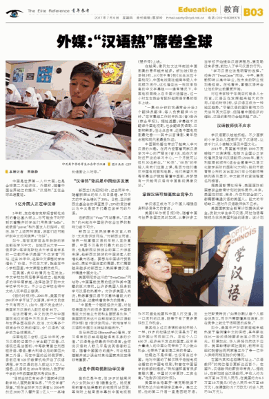 在该报看来,中文的流行与中国国际地位的提升不无关系——“中国与世界各国在经济、政治、文化等多个领域合作交流的增加,令‘汉语热’逐步成为全球潮流。”