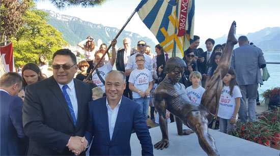 塑像揭幕仪式现场气氛很热烈,中国、瑞士两国国旗临湖飘起,蒙特勒市体操联合会的200多名会员穿着会服赶来,其中还有热爱体操的小会员,当地居民、过往游客把湖边的道路都挤满了。
