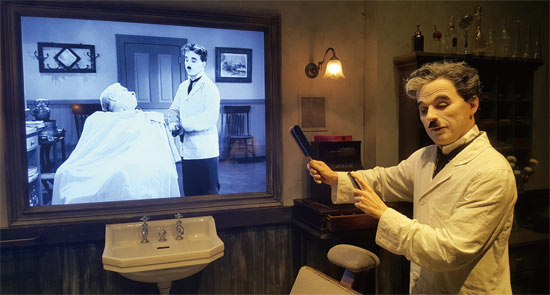 “卓别林世界”博物馆的另外一座主要建筑,内含16米高、能容纳150位观众的放映室,以及半地下的两层卓别林主题摄影棚。我们首先在放映室欣赏了一段卓别林的电影集锦。