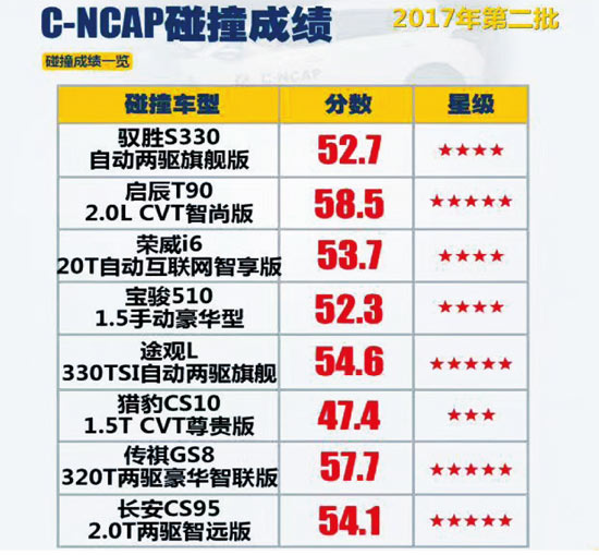 7月3日,中国汽车研究中心在天津发布了2017年度C-NCAP第二批车型评价结果。本次C-NCAP成绩共涉及8款车型,其中7款为SUV车型,一款为轿车车型。