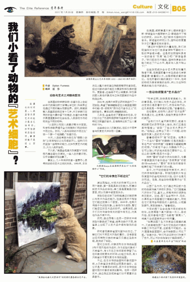“当我们为孔雀开屏而赞叹,或者为闻到野花的芬芳而身心愉悦,我们正是在某种程度上‘窃取’了独立艺术界的产物。”他指出,这带出了另一个问题:动物能否欣赏人类的艺术产物?