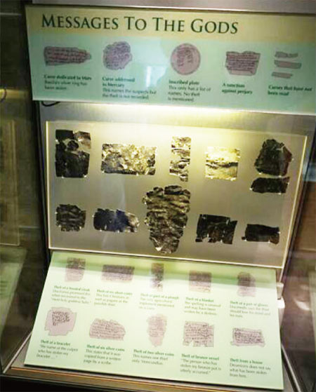 朝拜者来到圣泉边,向女神许下特别的愿望,把愿望写在一些很薄的小铅板上,然后卷起来,投入圣泉。在浴场展览厅里,我们看到了一些尺寸很小的刻有文字的小铅版。导游介绍说,这些铅版很有意思,上面文字的内容绝大部分是诅咒。这些铅板在上世纪70年代被发掘出来,被认为是遗址中最令人惊奇的发现。朝拜者把想诅咒的人名和诅咒原因刻在铅板上,然后投入浴池,希望在女神的帮助下,他们的愿望能成为现实。