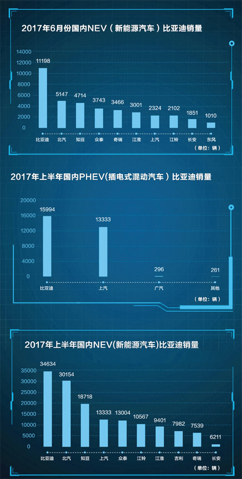 凭借6月新能源车的销量大爆发,比亚迪夺取了2017上半年中国新能源汽车销量第一的宝座,并最终力压北汽新能源。这对年初制定17万辆目标的北汽新能源来说,无疑是沉重的打击。