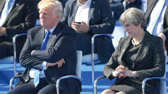5月26日,特朗普与特蕾莎·梅在布鲁塞尔出席北约峰会。