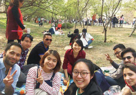 哈桑(左一)与同伴及人大新闻学院学生在玉渊潭公园游玩。