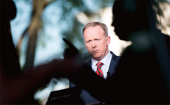 事实上,很多时候斯派塞是和媒体记者坐在同一条船上的。今年2月的一个上午,他和几家主流媒体的记者一起前往佛罗里达州棕榈湾的马阿拉歌俱乐部(即海湖庄园)。“你们爱打高尔夫球吗?”斯派塞有些讽刺地问。他当然知道答案是否定的,似乎是没话找话说。当时穿着一件黑外套的他显得疲惫不堪。