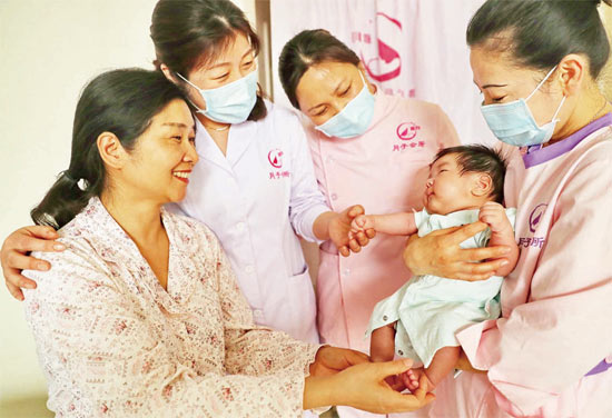 3月29日,河北省秦皇岛市一家月子会所内,护理人员让产妇和新生婴儿进行互动交流。图片来源CFP