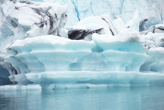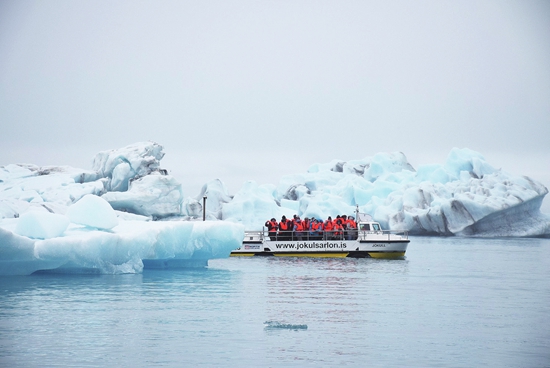 每艘游览船都配备一名讲解员,讲述冰湖的形成原因。沿途经过一座座形状诡异的冰山,游客会大拍特拍。讲解员还会挑选一座冰山靠上去,用锤子凿下一块冰给大家观看。冰山的颜色大致分为蓝白两种,幽蓝色断面的冰山是漂入冰湖时间较短的,或刚刚从冰川断裂下来的,经过长时间的阳光照射,蓝色会渐渐淡化,直至变为白色。冰山藏在水面下的部分大多是透明的,这是海水的压力挤压冰体,将气泡渐渐挤出所致。气泡越少,越透明的冰,“年龄”越大。讲解员凿下来的这块冰晶莹剔透,没有一丝杂质,几乎看不到一个气泡,据说有千年高龄。行至湖中央,驾驶员关闭游船发动机,让船在冰湖中自然漂浮,让游客感受冰湖寒冷而静谧的气氛。放眼远望,阴沉的天空,混沌的海水,甚至分辨不出海天之间的界限,身边一座座鬼斧神工的冰山蓝白相间,有些冰川上散落着一层层黑色的物质,讲解员告诉大家,那是千百年来积累的火山灰,逐渐变为一条条黑线。