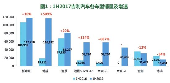 今年上半年,吉利三款SUV车型博越、帝豪GS和远景SUV销量占比达到44%,同比提升29.5%。尤其是博越,销量同比增长5倍,达到11.7万辆。