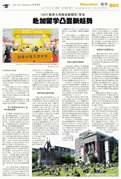 “值得留心的是,加拿大的电影拍摄和后期制作、营养学、动漫制作、海洋工程、体育管理等新兴专业,由于市场需求量增大而日益受到学生欢迎。特别是营养学,近两年有不少学生将留学目标对准麦吉尔大学、英属哥伦比亚大学和西安大略大学等名校的营养学或食品科学专业,因为不论是在加拿大还是国内,该专业的就业前景都非常好。”胡光告诉《青年参考》记者, “不过,由于留学选择渐趋理性,越来越多中国学生不再跟风热门专业,个人兴趣、职业发展乃至人生规划都成了重要的考量因素。”