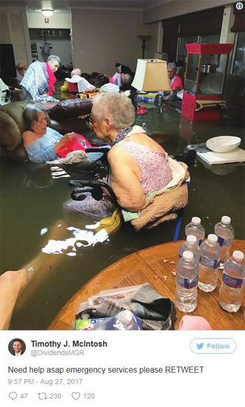 数千民众被困在家中等待救援,社交网络上热传的在水中“淡定”等待救援的养老院老人就是其中的一部分。直到这家养老院负责人的女婿发出推文求救,才引起救援人员注意。随后,直升机将老人们救出。