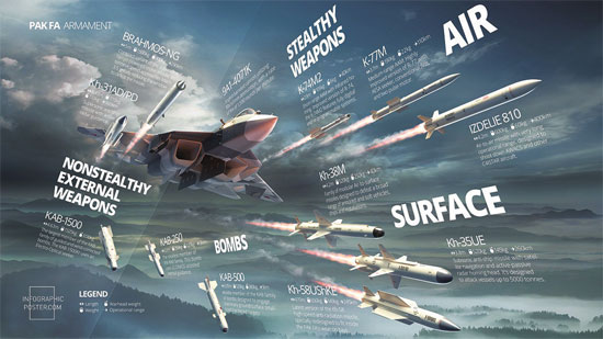 和F-22、PAK-FA和中国的歼-20一样,AMCA的内部武器舱能容纳至少4枚导弹,在对隐形性能要求不高的场合,还可外挂6~8枚空对空和空对地弹药。该机适用的武器既包括印度国产的,也兼容俄罗斯和以色列的进口产品,实战中可能以混合方式搭载。