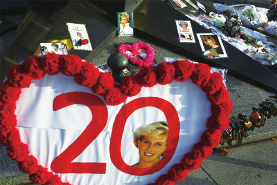 戴安娜去世20周年纪念日前夕,人们在白金汉宫门前摆放鲜花和她的照片以示悼念。