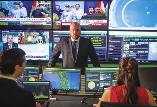 杰夫·查普曼(中)指挥下属就飓风救援行动展开数据分析
