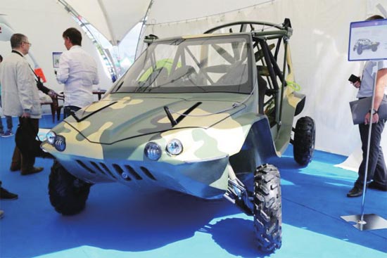 为帮助空降兵安全潜入敌后,俄罗斯军工人员同样费尽心思。据俄卫星新闻网报道,在今年7月的2017莫斯科航展上,来自皮亚季戈尔斯克的一家航空航天技术公司推出了一款令人耳目一新的水陆空三栖运输车,该车被称为“Triton”(蝾螈),暗示它拥有出色的适应能力。据该公司介绍,“Triton”采用双座设计,4轮驱动,车尾安装有直径一人高的螺旋桨作为飞行或在水中前进时的动力,两片垂直尾翼负责控制方向。