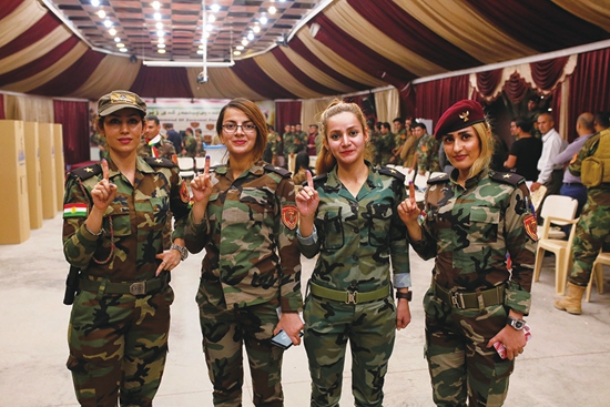 9月25日,库尔德女战士在一座军事投票站参加独立公投。她们勇上战场的世俗形象让西方世界青睐有加。图片来源CFP